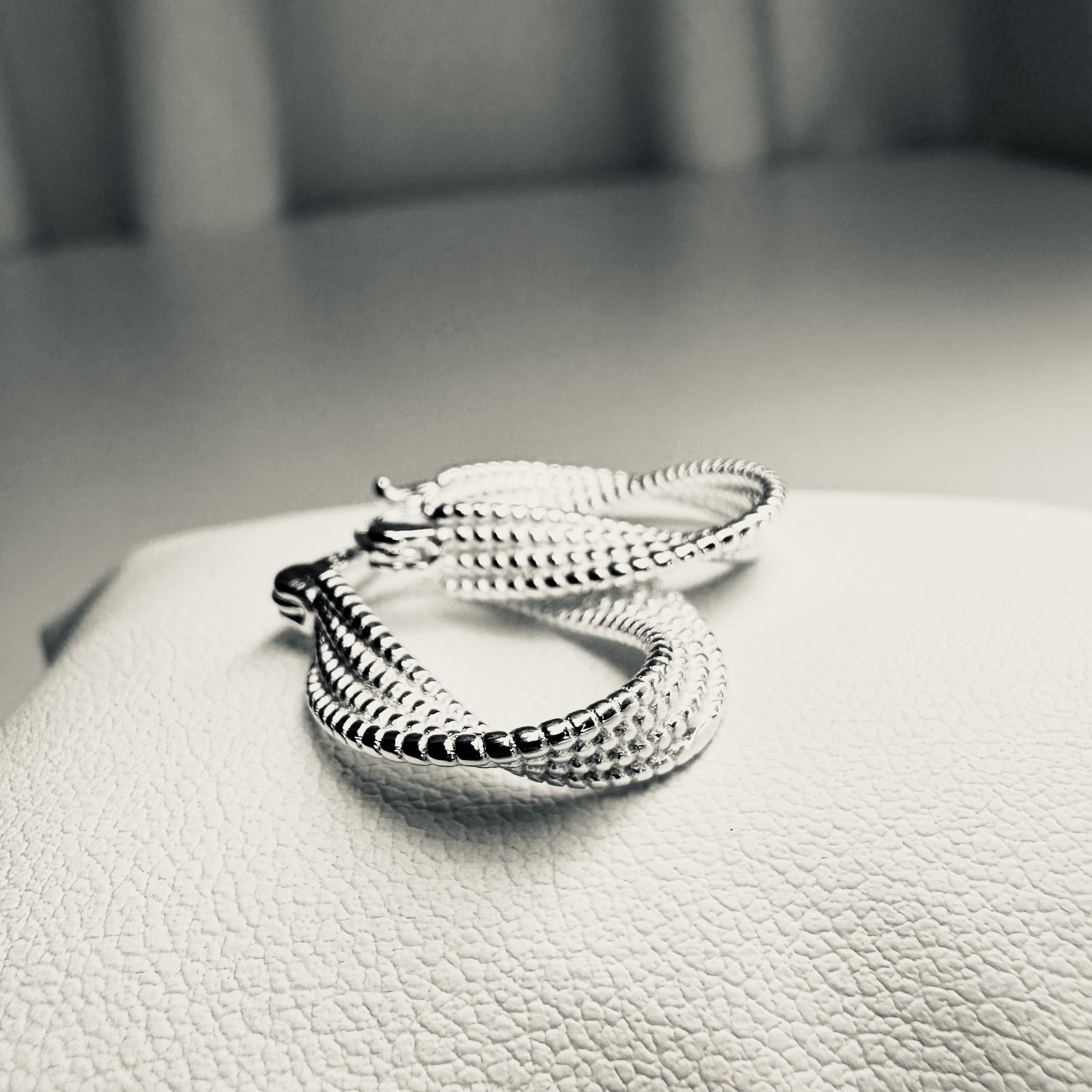 곱게 땋은 밧줄이 엮여 트위스트된 흔치않은 디자인의 귀걸이 입니다. 풍성해 보이는 디자인이지만 착용감은 가볍고 경쾌한 보면 볼수록 눈에 들어오는 상품 입니다.