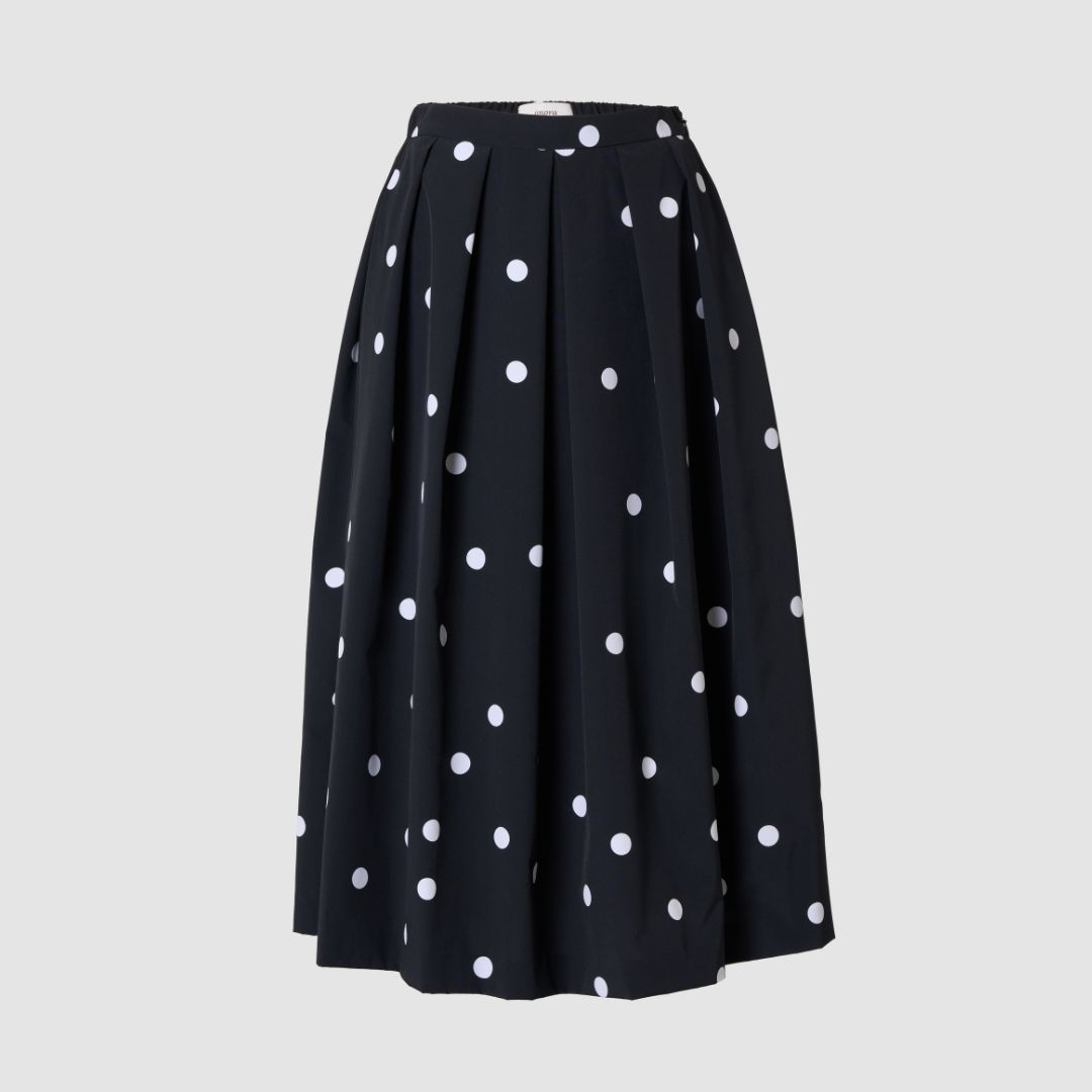 블랙베이스에 화이트 도트 무늬, 클래식 함 과 발랄함을 동시에 보여줍니다. 자연스러운 볼륨으로 절제된 풍성함을 주기 위해 허리라인부터 내려오는 주름 디테일에 신경을 많이 쓴 완성도에 집중한 피스입니다. UNI TXTILE의 하이퀼리티 소재로 얼룩 과 주름에 강한 최고급 타프다 소재를 사용하여 관리하기가 수월합니다. 무게감이 느껴지지 않으며, 허리 뒷 부분을 밴드를 넣어 편안함을 강조하여 클래식 라인의 스커트입니다.