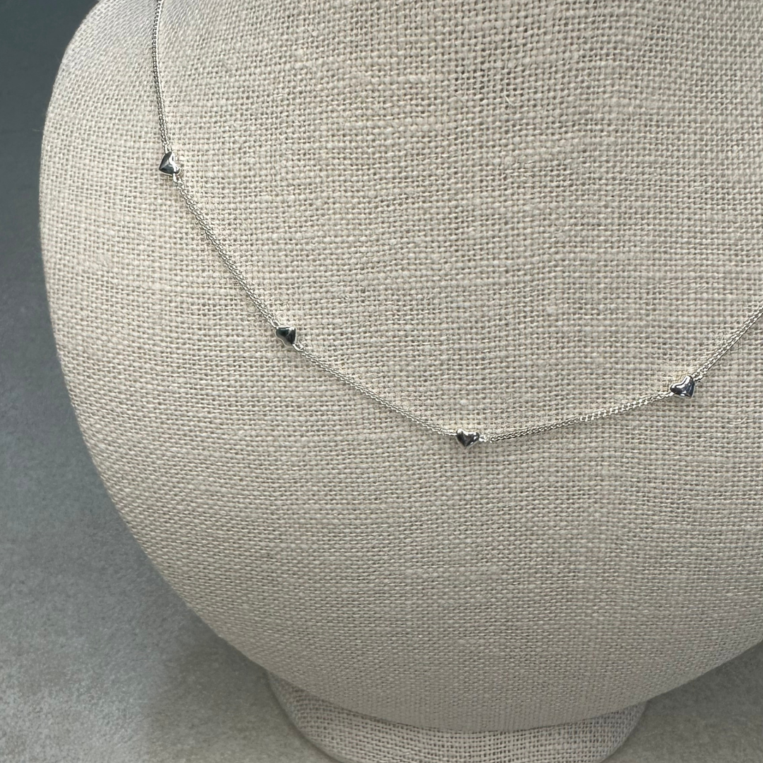 9개의 3mm 미니하트로 둘러져 있는 사랑스러운 목걸이 입니다. 쁘띠 사이즈로 레이어링 하기 좋게 O링 4개를 체인 중간에 넣어 초커처럼 또는 일반 목걸이처럼 착용할 수 있는 활용도 높은 아이템 입니다.