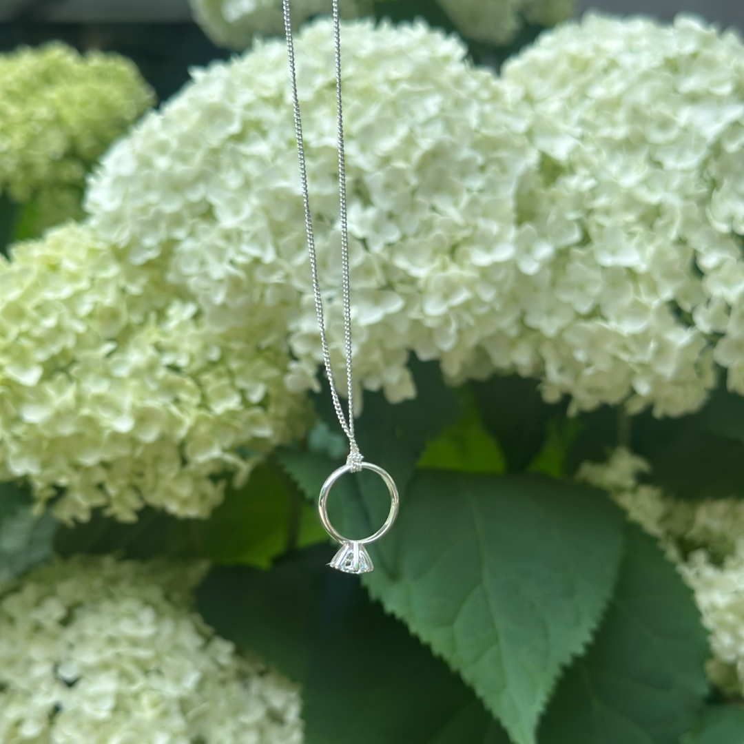 움직일 때 마다 살짝살짝 우아한 빛을 발하는 웨딩링 팬던트 롱네크리스 입니다. 5cm 꼬리체인을 이용하여 길이 조절이 가능합니다.