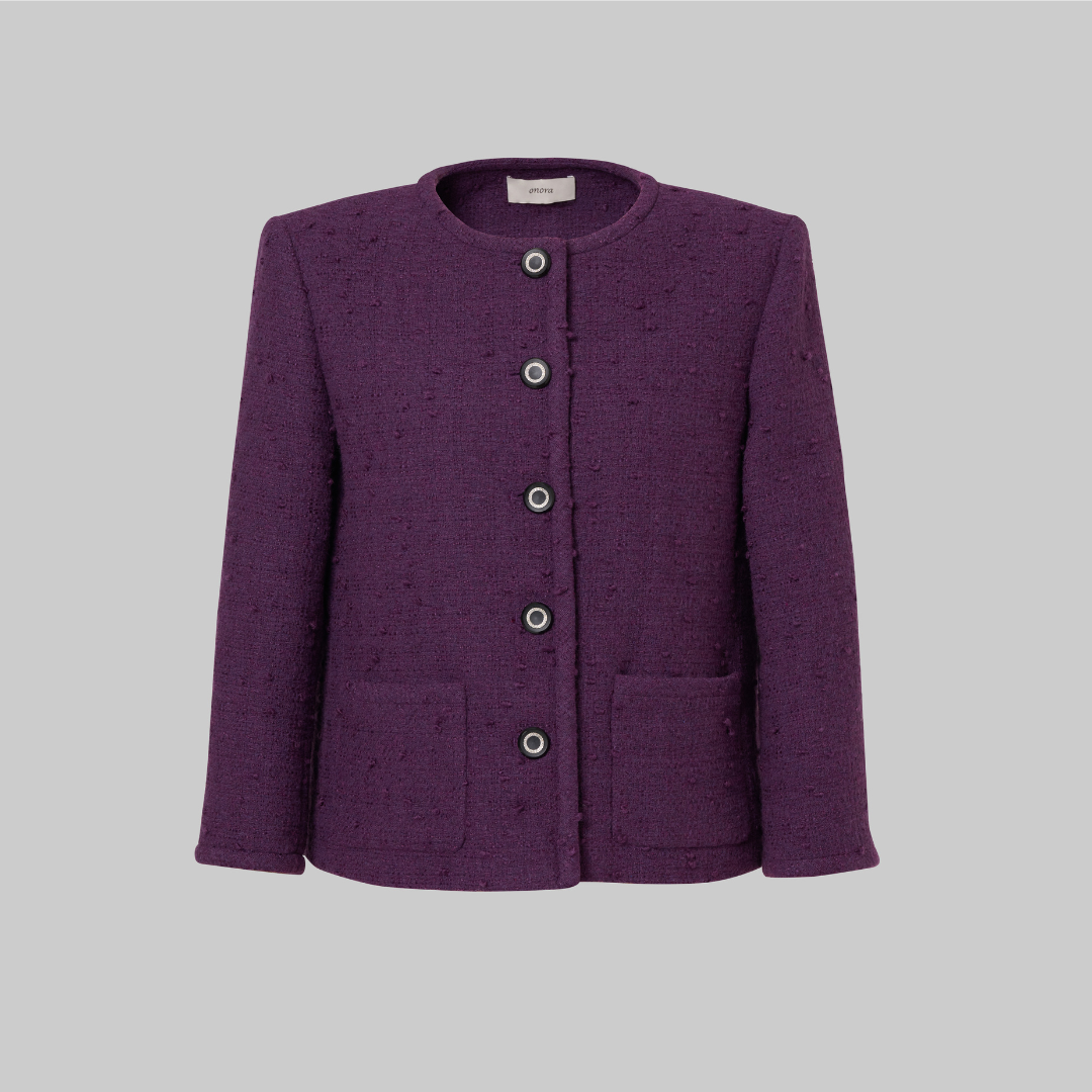 Perfectly cute and lavishly purple! 네이비 와 버건디 컬러가 적절히 믹스된 흔하지 않은 미디움 톤의 임페리얼 퍼플 컬러의 트위드 재킷입니다. 눈에 뛰는 퍼플이 아닌 미디움 톤의 퍼플로 진한 고급스러운 컬러감을 느끼셨는지요? 몽글몽글 올라온 텍스쳐의 섬세한 역임으로 짜인 소재, 그 자체에서 주는 아름다운 조직감이 돋보이는 콤비 마감 재킷입니다.